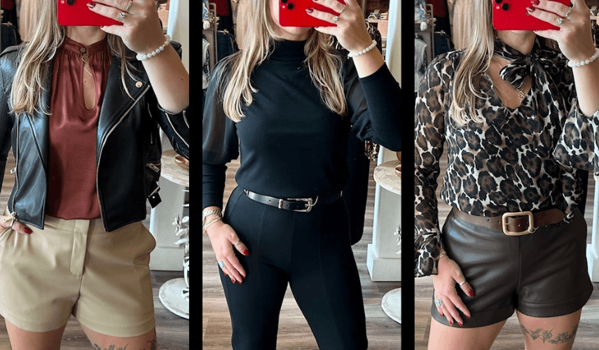 Leopard print is back—but honestly, was it ever gone? This sheer blouse with bow-tie detail is playful and sophisticated, especially when tucked into chocolate leather shorts. The bold belt cinches the waist and adds definition to balance the flowy sleeve.